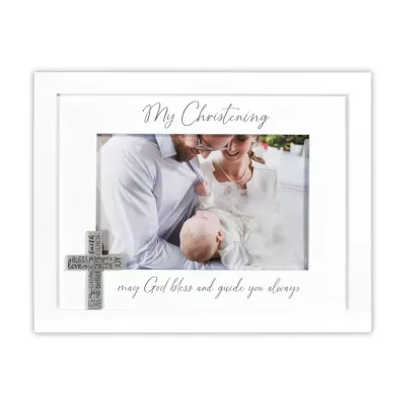 Add a touch of style to your home decor with this beautiful picture frame. The perfect way to display your treasured photo. This decorative frame holds one 4"x6" horizontal photo and features a raised, white outer mdf wood moulding and a white, lightly grained wood mat with the words "my christening" and the phrase "may god bless and guide you always" screen printed in gray text. Silver finish metal cross attachment. This freestanding, easel backed picture frame will display perfectly on a table or shelf. Optionally, use the attached hardware to create a wall display. Swap out photos easily with swing tab closures. Picture frame includes a durable glass front that will protect and showcase your precious photo for years to come.