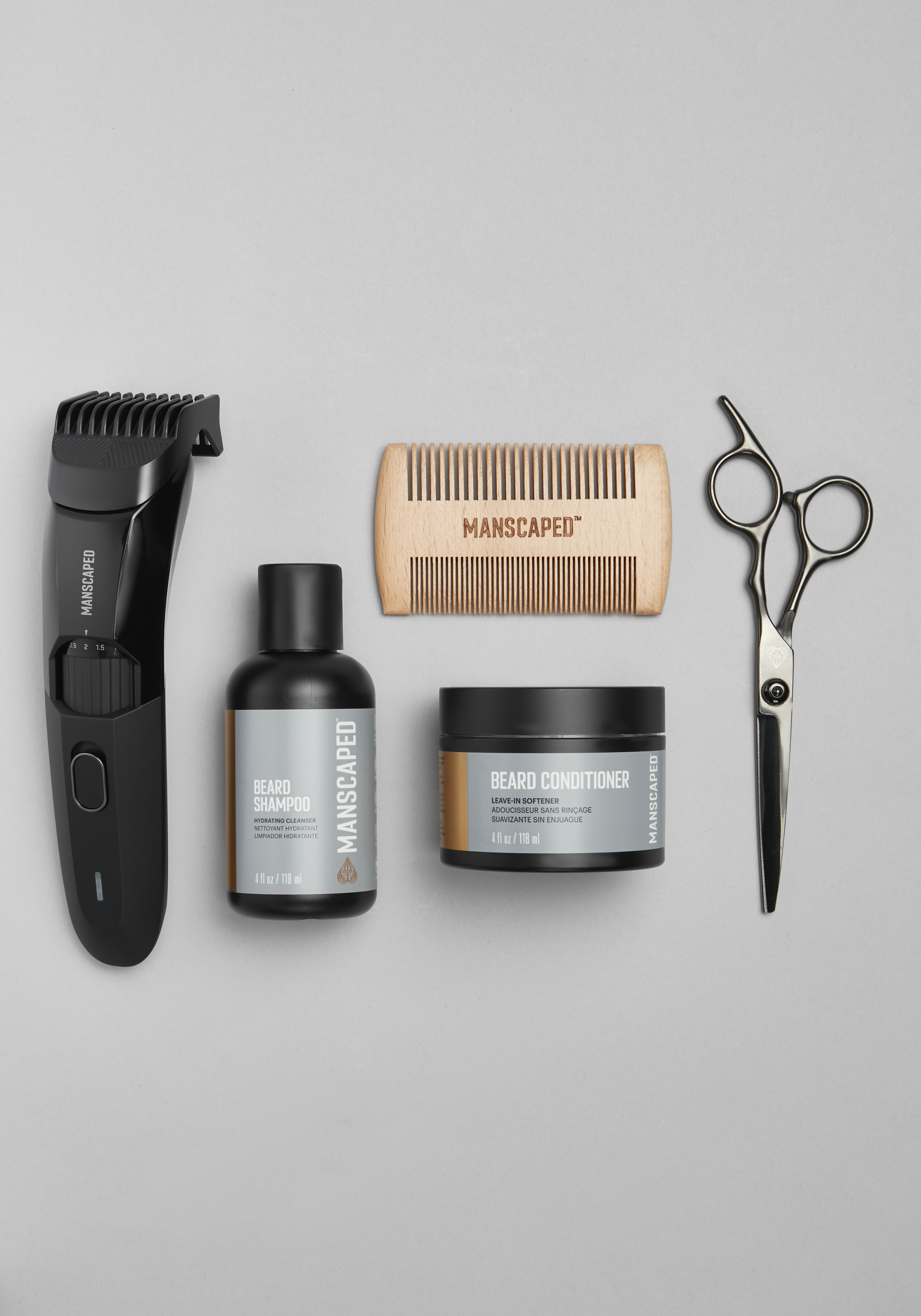 Grow and maintain a magnificent beard with a little help from Manscaped. This comprehensive kit includes a precision beard trimmer, shampoo, conditioner, scissors and a comb. Imported.