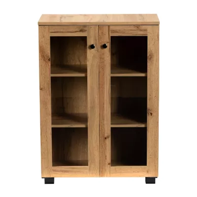 With a minimalist yet bold design, the mason storage cabinet organizes your space in contemporary style. Made in malaysia, this cabinet is constructed from oak brown finished wood that adds visual warmth to the current interior of your home. Three spacious shelves behind the glass doors create a convenient display to organize decorations and declutter busy rooms. Requiring assembly, the mason is equipped with two black finished metal door knobs that add a modern touch to the rustic aesthetic of the cabinet. A handy addition for any kitchen, living room, or hallway, the mason storage cabinet is a versatile upgrade to the modern home. Dimensions: 33" high x 23.6" wide x 12.6" deep; shelves: 9.7" high x 22.32" wide x 11.22" deep;