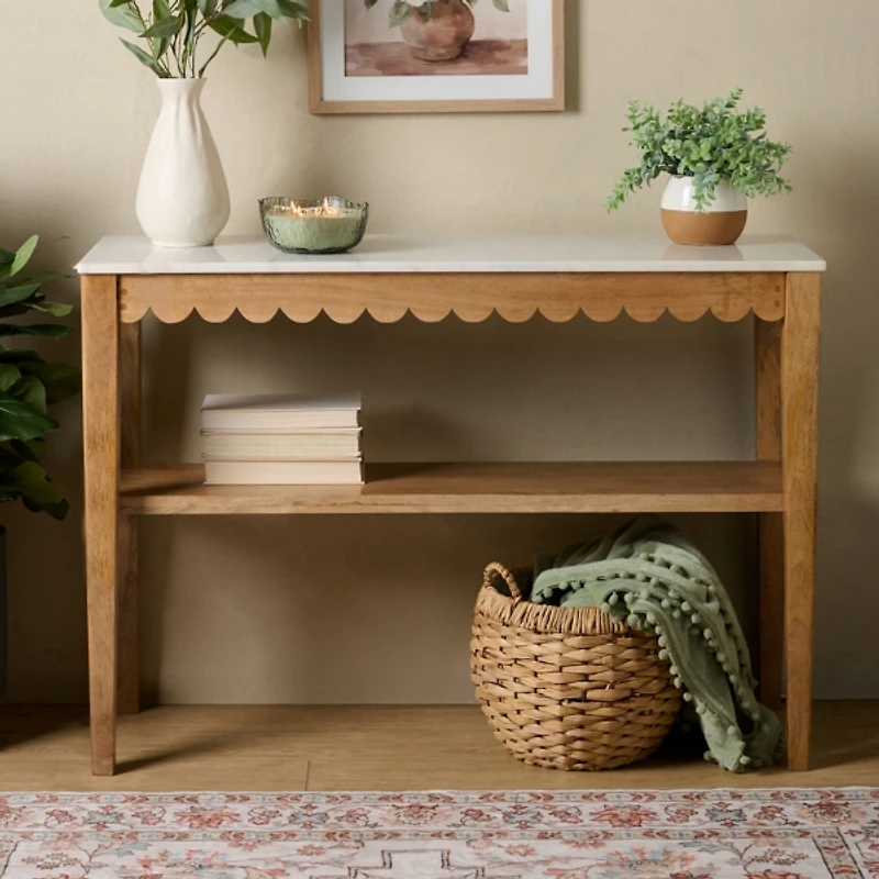 The smooth, white marble tabletop gives this Marble and Wood Ayla Console Table an elegant touch, while its scalloped trim brings out a bit of playfulness. Easily refresh your entryway or hall with its charming style! Overall dimensions Width: 42.5 in. Depth: 14.5 in. Height: 30 in. Crafted of acacia wood and marble Natural base finish White marble tabletop finish Features a lower shelf Scalloped trim Weight: 65.6 lbs. Assembly required Not intended for commercial use Care: Dust with a soft, dry cloth. Contact your local Kirkland's store for availability. Quantities and selection may vary by location. WARNING: Cancer and Reproductive Harm - For more information go to www.P65Warnings.ca.gov .