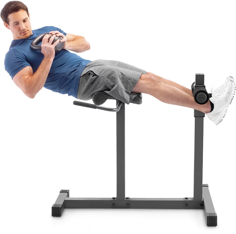 Strengthen and tone your back and abdominal muscles with the Marcy Hyperextension Roman Bench, which features sturdy construction for a stable base. The handles feature grips to ensure a secure hold for easy on and off, and the adjustable leg support is designed with foam rolls for comfort.