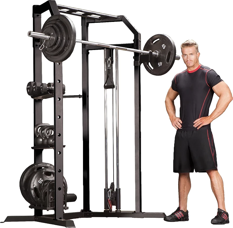 Get a great workout with the Marcy Power Cage, which features a multihandle pull-up station with wide and narrow grips and dip handles for tricep and chest development. High and low pulleys for upper and lower body exercises. Dumbbell and kettle weight shelves and a weight plate organizing rack provide convenient storage. Adjustable, commercial-style bar catches.