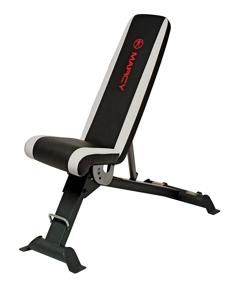 The Marcy Weight Bench features a 4-position adjustable back pad for performing chest, incline, military and decline press exercises and assist handles for performing abdominal leg raise exercises. Powder-coat steel frame construction and high-density foam upholstery ensure durability and comfort, and the bench folds flat for convenient storage.