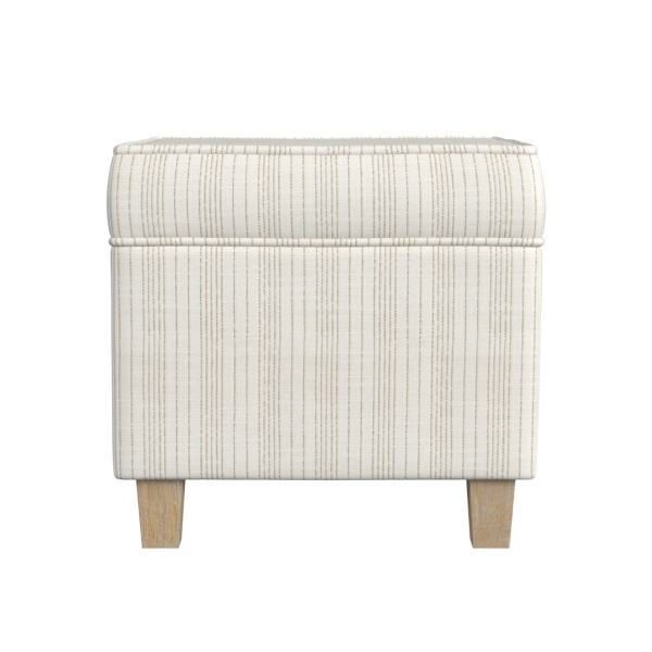 Bring a touch of pattern to your space with this Marigold Stripe Upholstered Square Storage Ottoman! You'll love how this ottoman elevates your home as a sophisticated storage solution! Ottoman measures 17.5L x 17.5W x 16.5H in. Crafted with a plywood and MDF frame Upholstered in polyester with a foam cushion fill Natural leg finish Cream and light brown pinstripe upholstery finish Features a lift-off lid Square shape Weight capacity: 250 lbs.; weighs 15.4 lbs. No assembly required Not intended for commercial use Care: Spot clean with damp cloth only. This item is available at Kirklands.com only, not available in stores. Please note: this item cannot be shipped to APO/FPO addresses. WARNING: Cancer and Reproductive Harm - For more information go to www.P65Warnings.ca.gov .
