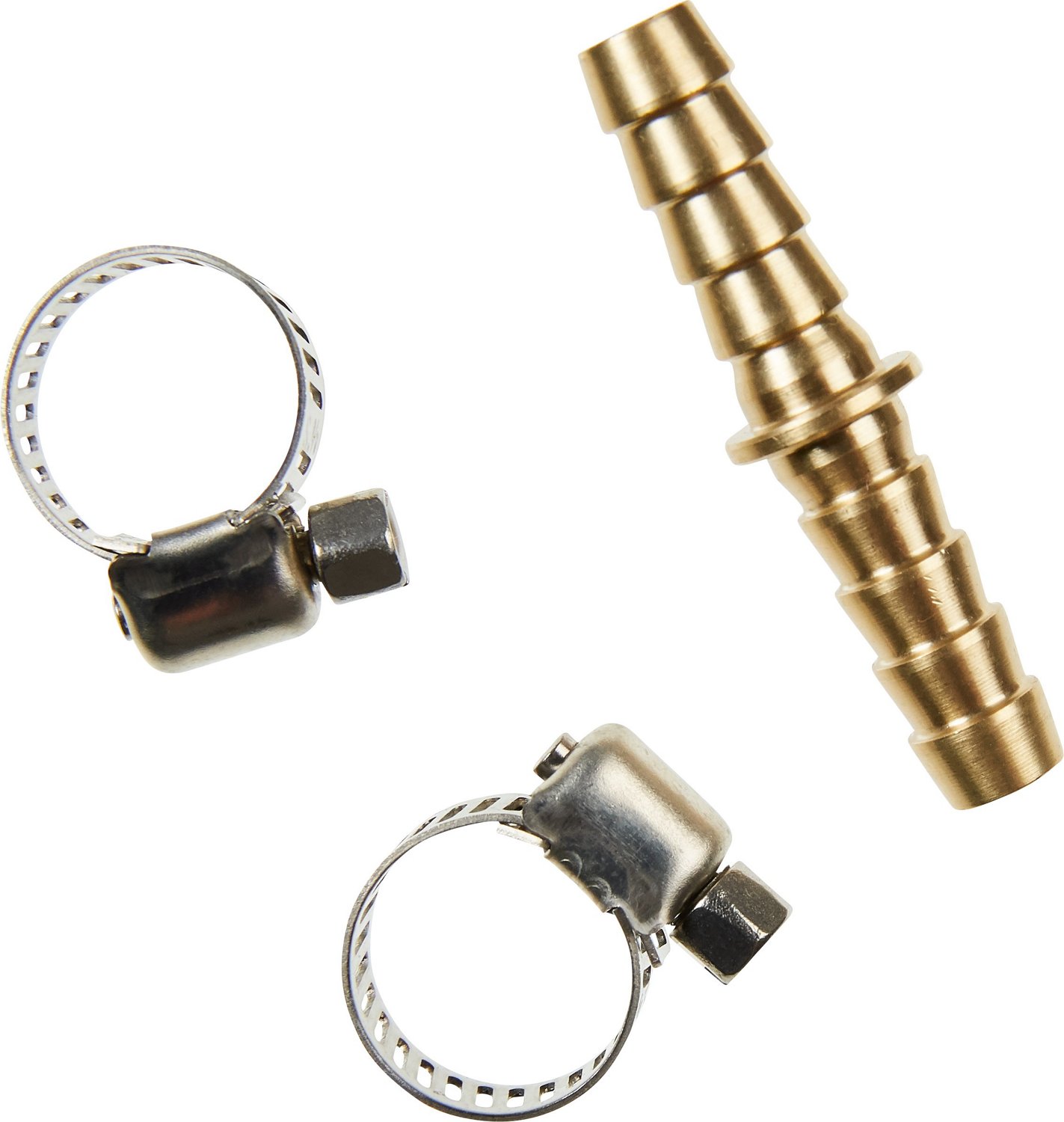 - Includes a solid brass fitting, double 5/16-inch hose barbs and 2 stainless-steel hose clamps