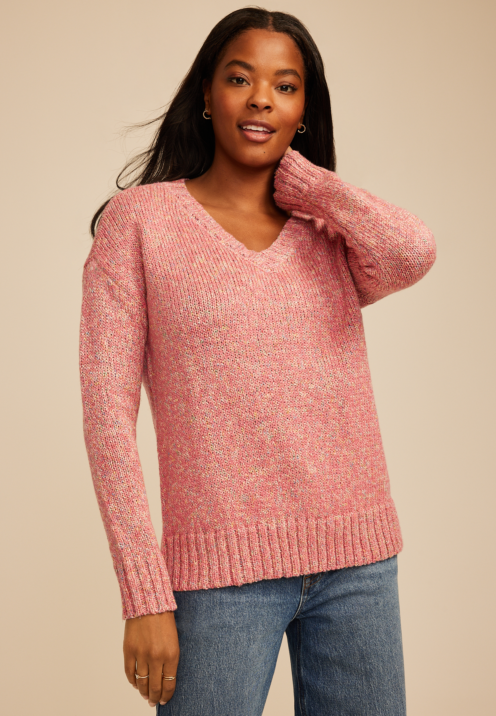 A soft, marled knit that wraps you in warmth and an easy, comforting softness, creating a piece that feels right at home during slow mornings and unhurried afternoons. the gentle v‑neckline brings a touch of openness, while the relaxed silhouette offers that naturally lived‑in feel — the kind of sweater that settles effortlessly into weekly rotation. pair it with vintage‑wash denim for an easy off‑duty mood, or layer it over a crisp poplin shirt to add texture and dimension. it moves beautifully with winter neutrals and also brings a soft, uplifting pop beside deeper cold‑weather tones.