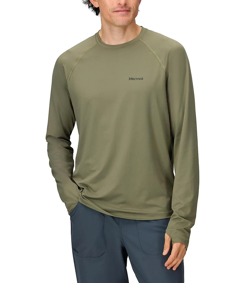 From Marmot, this t-shirt features: Crew neckline Long, raglan sleeves Thumbholes that provide additional sun coverage for the back of your hands Marmot logo printed at left side of chest Pullover construction Lightweight, breathable wicking knit fabric Sun protection with ultraviolet protection factor (UPF) of 50 Quick-drying REPREVE® Recycled polyester/elastane jersey Machine wash/tumble dry Imported.