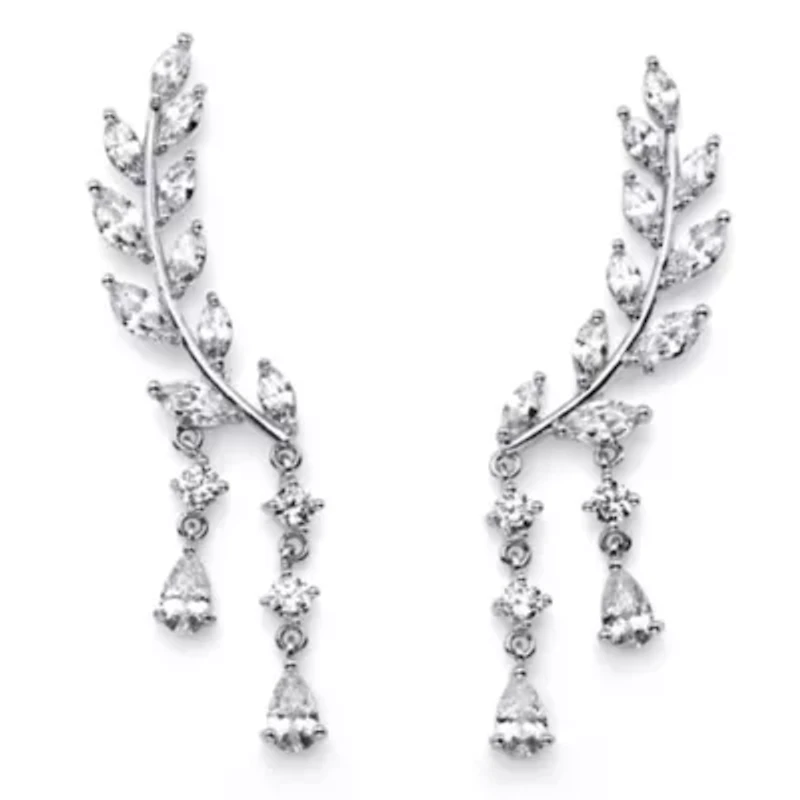 These sparkling ear climbers wrap your ears in a flourish of marquise-cut crystals and shine. Each earring features a dangling pear drop at the bottom and can be worn as drops or climbing the ear. 1.75" length. Silvertone.Main Stone: 6 Marquise Faceted Cut Crystals, 5 mm x 2.5 mmAccent Stone: 24 CrystalsSilvertoneMeasures: 8 mm wide x 43 mm long x 2.5 mm highIncludes gift box and drawstring pouchSilvertoneDimensions: 8 mm wide x 43 mm long x 2.5 mm highIncludes gift box and drawstring pouch 2 Pierced ear, 30 Polished finish Warranty available China Imported Product Specifications 0.41 in x 1.69 in x 0.31 in Material & Care Silver-tone metal Metal, Silver-tone metal Clean with a soft cloth.