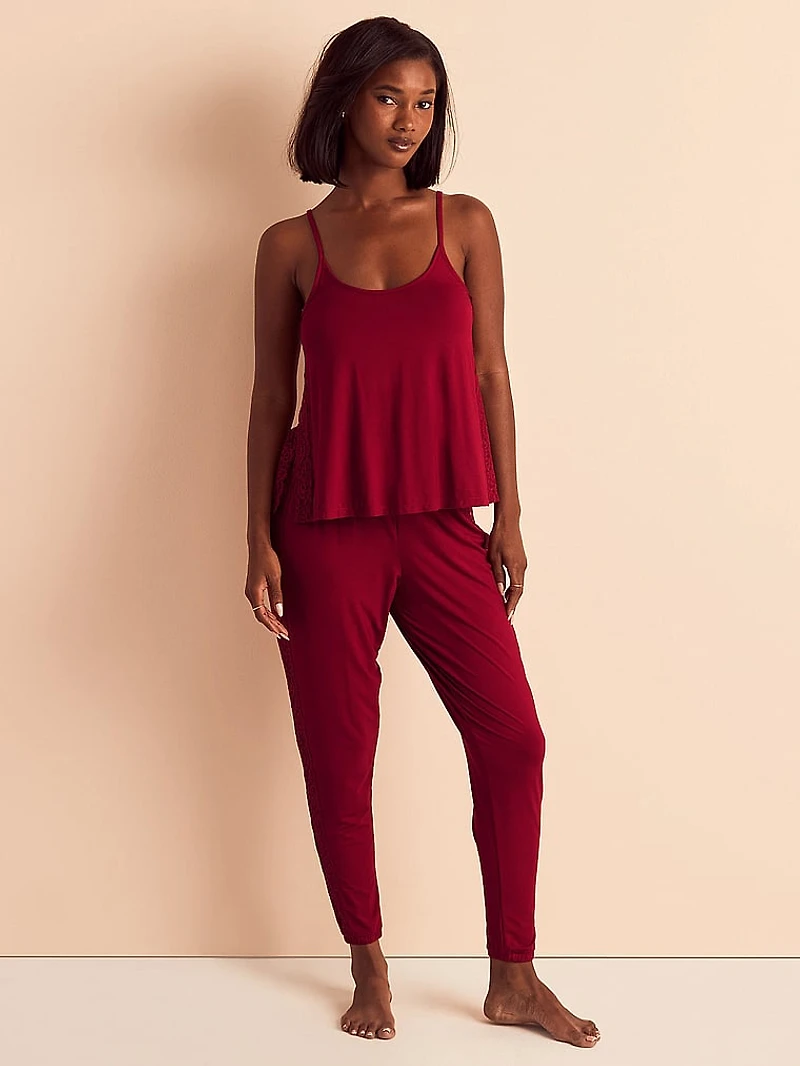 This Cami and Jogger Set is designed for easy movement and laid-back elegance. With lace paneling down the sides, the soft camisole offers a flattering, breathable fit, while the joggers feature a relaxed silhouette that feels cozy and elevated.