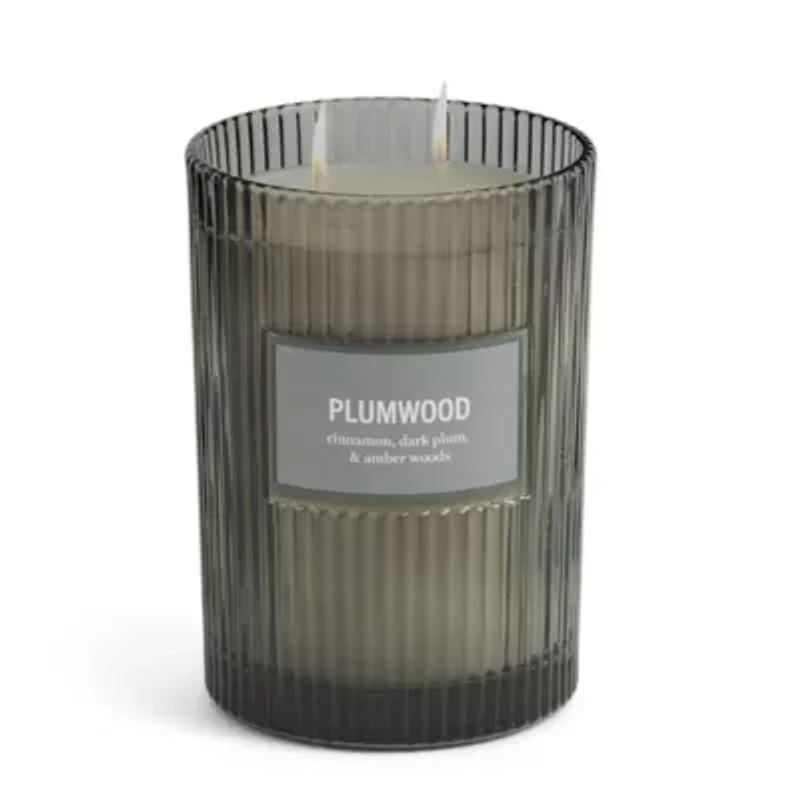The Plumwood two-wick candle from Martha Stewart blends deep fruit accents and spicy connamon and amber for a refined fragrance experience that feels like a comforting evening in, and its textured glass jar enhances your decor.