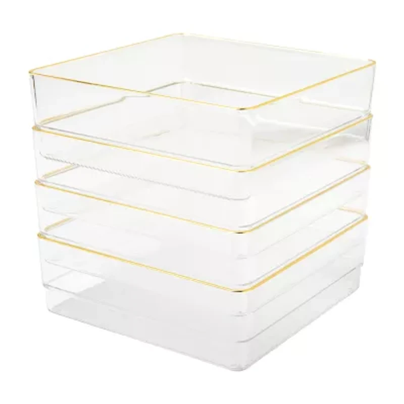 Thoughtful, functional storage is at your fingertips with this 4 pack of 6" x 6" Martha Stewart Kerry stackable organizers. Clear, bpa-free plastic bins are elevated by beautiful gold trim and can be configured on demand for a custom fit in a drawer or on top of your work surface. Recessed bottoms allow the components to slide from side to side for quick access and stack vertically making them an ideal storage solution for small spaces. Non-slip feet ensure these organizer trays stay where you put them and the sophisticated, versatile design multitasks in countless other living spaces requiring tidy, clutter-free surfaces.