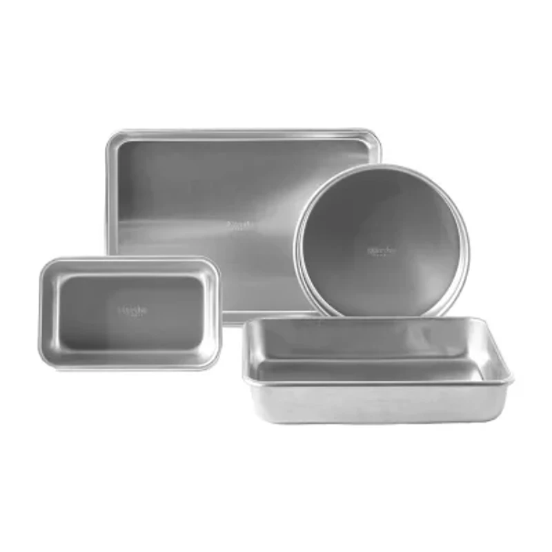 A complete set for any budding or veteran home cooks who enjoys making pan-roasted side dishes, baking artisanal breads, serving up cookies and homemade birthday cakes.Set includes one each: 9x5 loaf pan, 9" round cake pan, 12" baker, 15" cookie sheet.