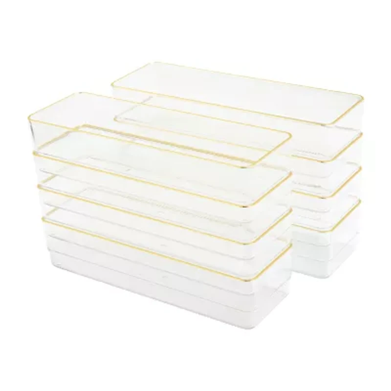 Thoughtful, functional storage is at your fingertips with this 8 pack of 9" x 3" Martha Stewart Kerry stackable organizers. Clear, bpa-free plastic bins are elevated by beautiful gold trim and can be configured on demand for a custom fit in a drawer or on top of your work surface. Recessed bottoms allow the components to slide from side to side for quick access and stack vertically making them an ideal storage solution for small spaces. Non-slip feet ensure these organizer trays stay where you put them and the sophisticated, versatile design multitasks in countless other living spaces requiring tidy, clutter-free surfaces.