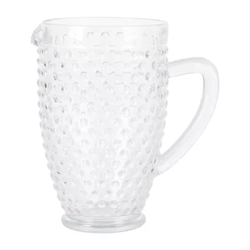 The Chauncey 56oz hobnail glass pitcher from Martha Stewart offers servings of vintage charm with defined hobnail designs for added depth and dimension. Durable glass construction features a generous capacity for any drink of your choice. The shaped spout and sturdy handle support easy pouring and confident serving. Style your kitchen with fresh flowers in this glass pitcher that can double as a vase. Flowers are a simple way to add a pop of color to any culinary space. Dishwasher safe. Top rack only. Do not microwave.
