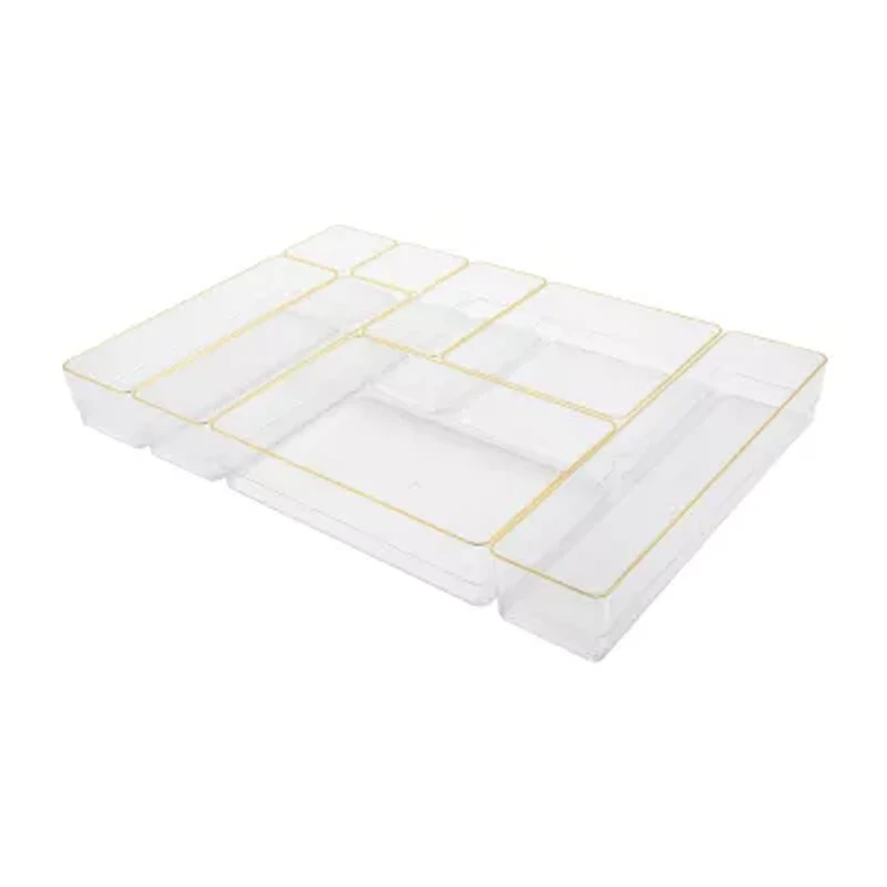 Thoughtful, functional storage is at your fingertips with this variety set of 8 Martha Stewart Kerry stackable organizers. Clear, bpa-free plastic bins are elevated by beautiful gold trim and can be configured on demand for a custom fit in a drawer or on top of your work surface. Recessed bottoms allow the components to slide from side to side for quick access and stack vertically making them an ideal storage solution for small spaces. Non-slip feet ensure these organizer trays stay where you put them and the sophisticated, versatile design multitasks in countless other living spaces requiring tidy, clutter-free surfaces.