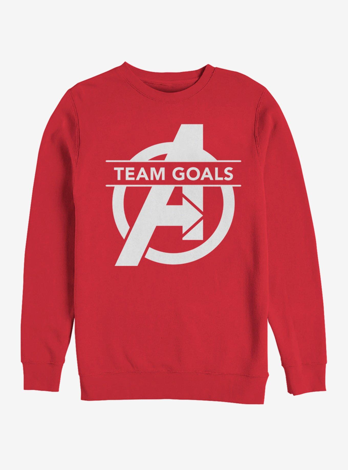 Team goals - or SWEATSHIRT goals?! This red sweatshirt has a bold white Avengers logo with a "Team Goals" overlay. Assemble!