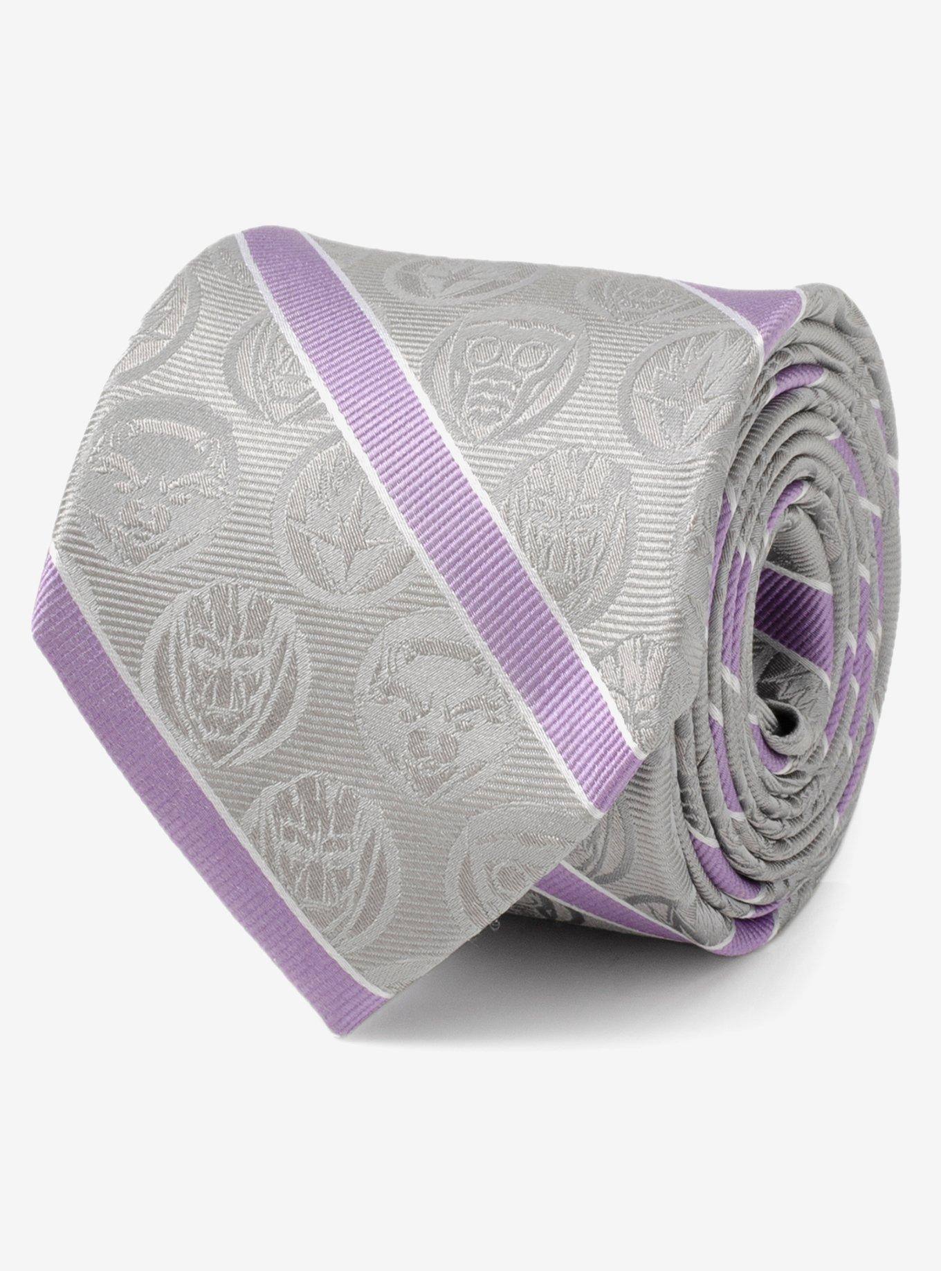 Classic colors meet modern design in this Guardians of the Galaxy tie. Made from 100% silk in a slim design. Nestled between the lavender diagonal stripes, you'll find the gray motifs of the iconic characters such as Star-Lord, Rocket Raccoon, Groot, as well as the official Guardians of the Galaxy logo. Officially licensed by Marvel. Item cannot be shipped to P.O. Boxes