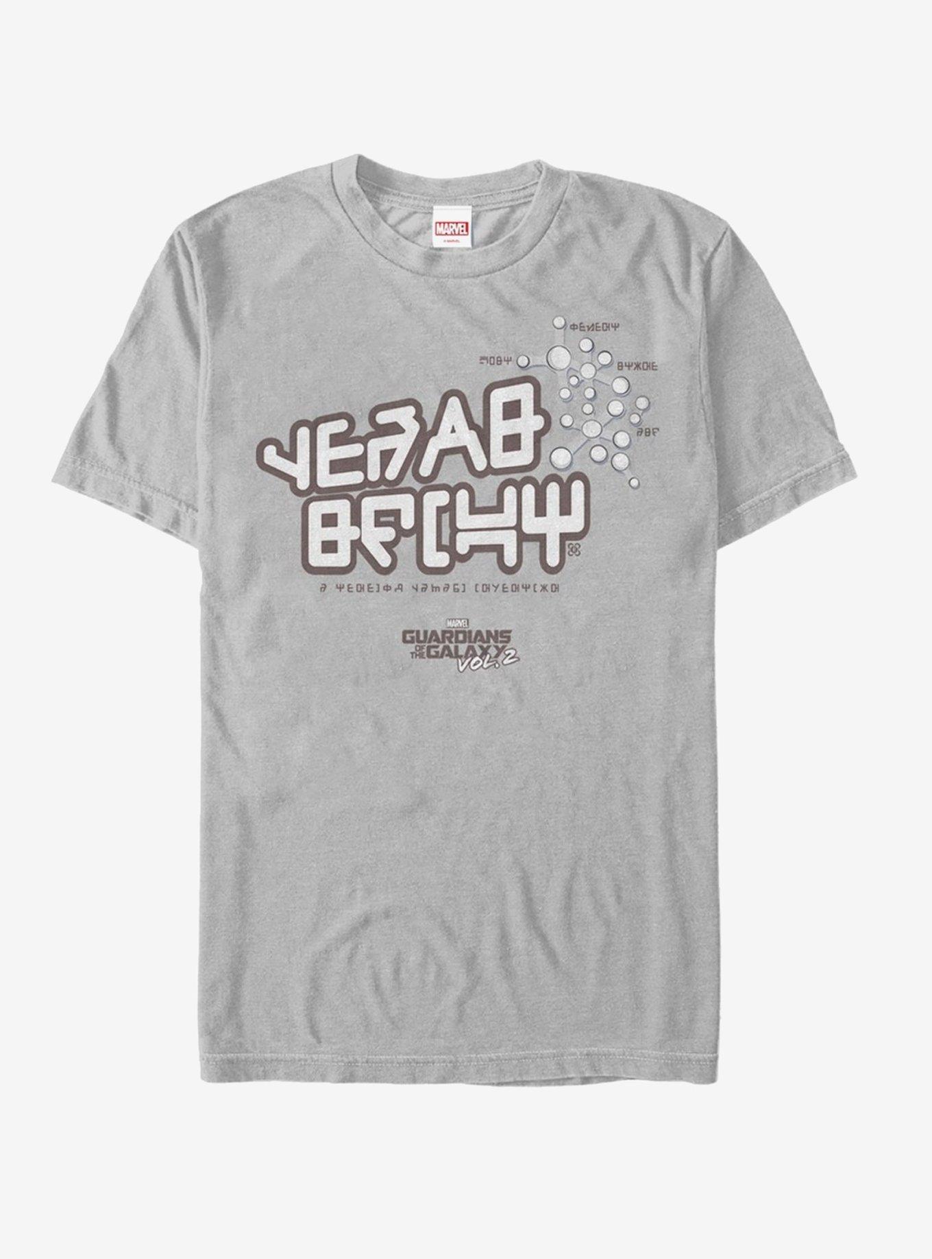 If you're going to be saving the galaxy, make sure to be wearing the Marvel Guardians of the Galaxy Vol. 2 Star-Lord Tee Alien Text Silver T-Shirt in all your photo ops! It's time to crack the code and decipher Star-Lord's iconic shirt that reads "Gears Shift Dust Cement Stone Ash" and "A Teneyck Galaxy Invention" in an alien alphabet across the front of this epic light gray Guardians of the Galaxy Vol. 2 tee! 100% Cotton.