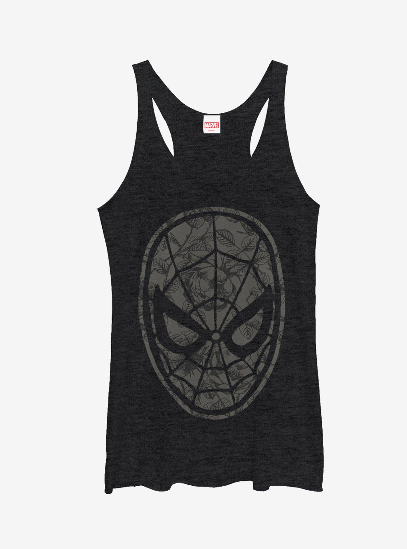 Spidey is taking a break from saving the world to stop and smell the roses with the Marvel Spider-Man Grayscale Floral Print Heather Black Racerback Tank Top! This fun black Marvel tank portrays Spider-Man's mask in a grayscale floral print; a perfect way to add some unique flare to a tried-and-true favorite. 50% Polyester, 25% Cotton, 25% Rayon. Designed with raw edge hems