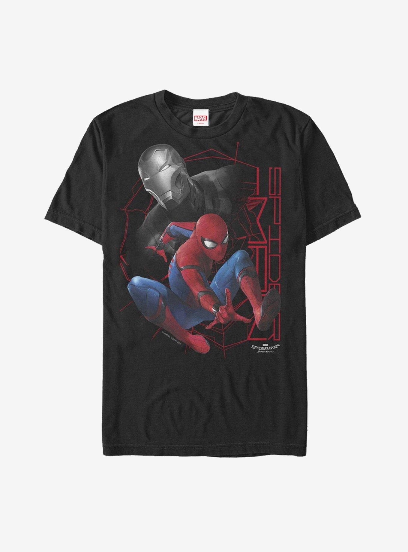 Peter can't wait to become a full-time Avenger, especially if his suit looks anything like the Marvel Spider-Man Homecoming Iron Man Grayscale Black T-Shirt! A red and blue print Spider-Man is displayed across a grayscale Iron Man on this epic black Marvel tee. 100% Cotton.