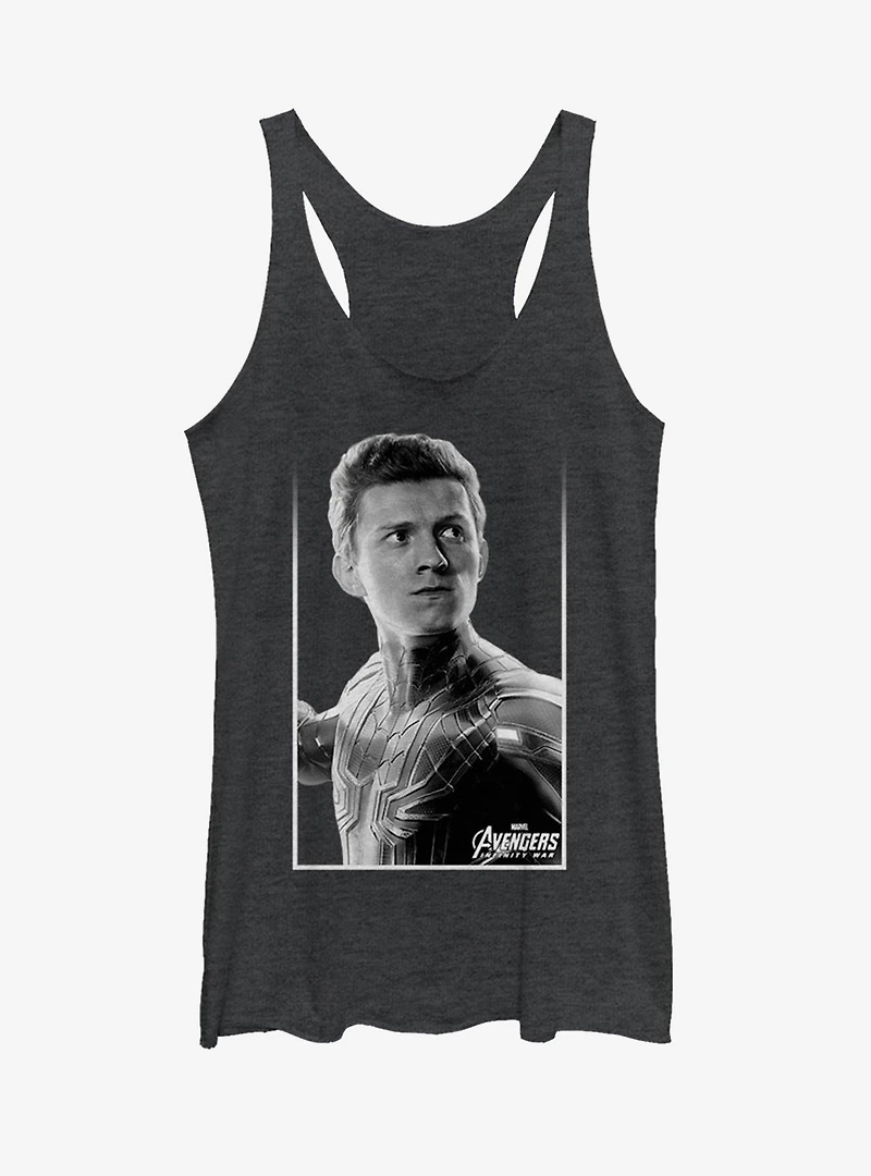 Thwip! Tom Holland as Peter Parker (AKA Spider-Man) from Avengers: Infinity War adorns the front of this heather black tank.