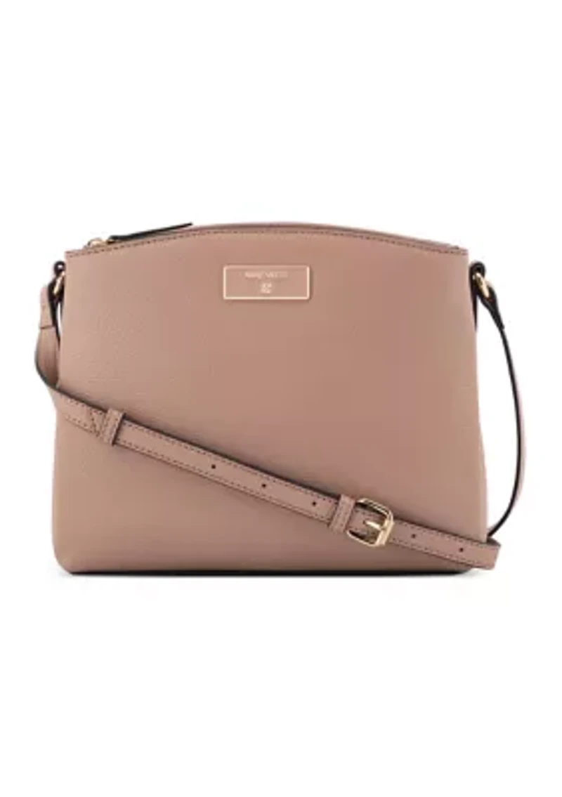 Stay stylishly organized with this triple-compartment crossbody from Nine West. Designed with internal slip and zipper pockets, it keeps your essentials neatly in place while bold hardware and signature branding add a polished touch. The chic chain strap offers hands-free ease, making it the perfect companion for busy days and stylish nights out. Crossbody strap Triple compartment Interior: slip and zipper pockets Imported Product Specifications 10" x 3" x 8" Material & Care Faux leather Wipe clean