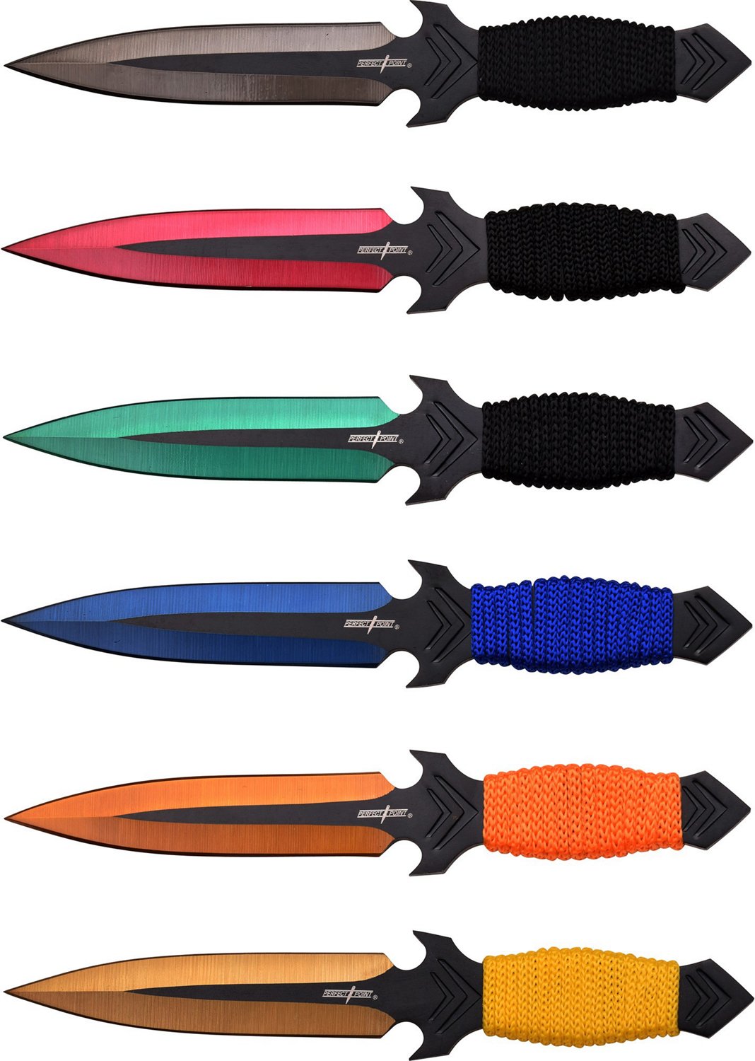 Practice your aim with the Master Cutlery Perfect Point 6-Piece Throwing Knife Set. This set includes six 6.5-inch knives with 3 millimeter thick stainless steel blades and assorted color cord wrapped handles.