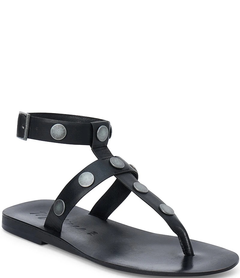 From Matisse, the Alexis Leather Thong Gladiator Sandals feature: Leather upper Metallic disc ornaments Buckle closure Synthetic lining Synthetic outsole Approx. 0.5" heel height Imported.