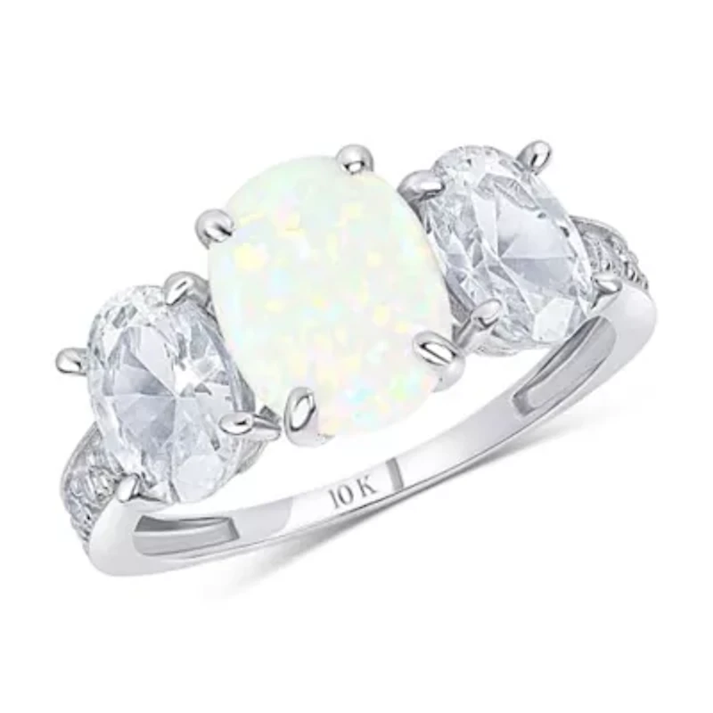 MAX + STONE Solid 10K White Gold White Opal Rings for Women | Created October Birthstone Ring with Three Stones | Anti Tarnish Statement Cocktail Opal Gemstone Rings Size 7 13 Polished finish Prong setting KR Imported Belk Exclusive Product Specifications 23.31-MM x 20.51-MM x 9.07-MM, 23.31 0.22 Material & Care Metal Metal, Gold Clean with a soft cloth.