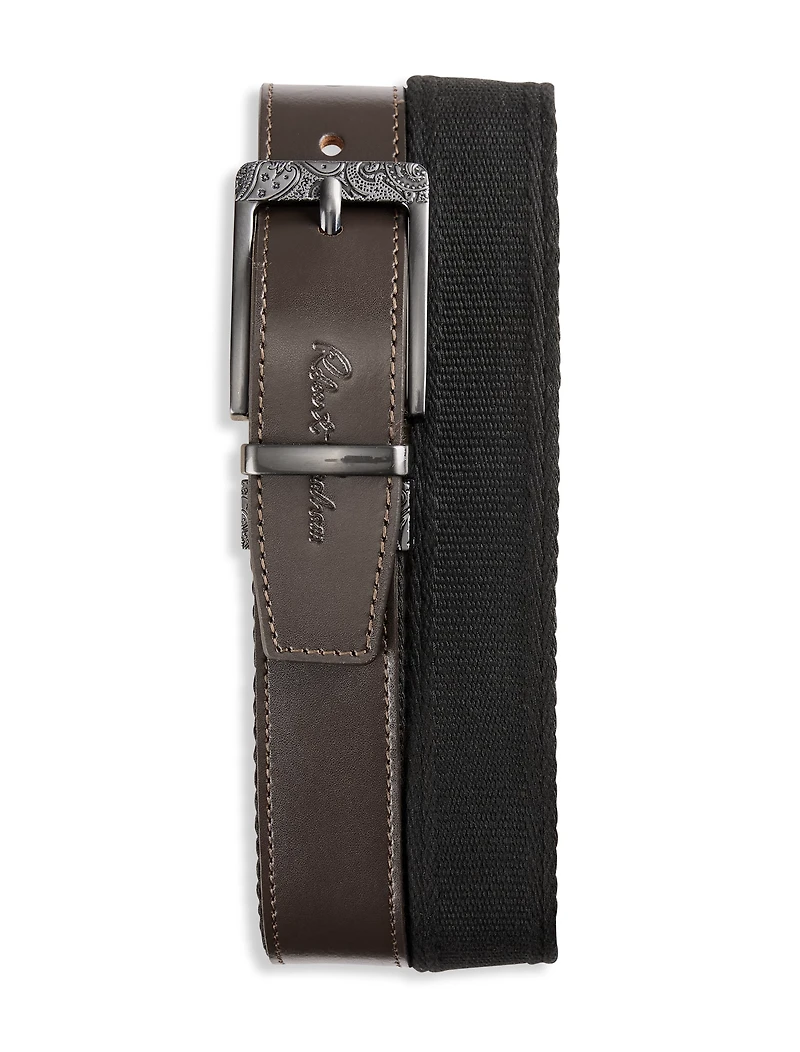 Designed with the expert craftsmanship and attention to detail that you'd expect from Robert Graham, this stylish belt offers two looks in one distinctive piece. It easily reverses from brown leather to black cotton, allowing you the freedom to customize your look every time you wear it.
