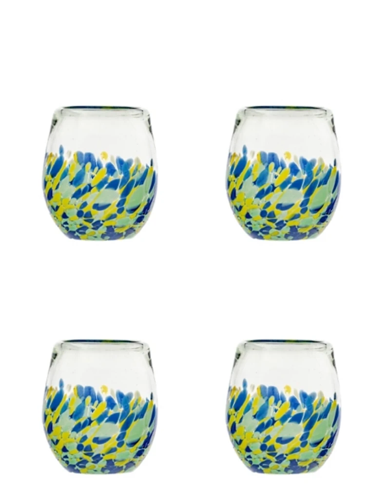 Bring handcrafted, artisan beauty to your dinner parties with the set of Mazatlan Stemless Wine Glasses. Swirls of blue, green, and yellow will awaken your tablescape with vibrant, Mexican craft. Set includes four (4) glasses Each glass measures 4.1H x 3.9 in. in diameter Holds up to 14 oz. each Made with eco-friendly, recycled glass Handcrafted by skilled artisans using a traditional glassblowing technique Swirled fleck patterns Hues of blue, yellow, green, and clear Food safe Care: Dishwasher safe. This item is available at Kirklands.com only, not available in stores. Please note: this item cannot be shipped to APO/FPO addresses.