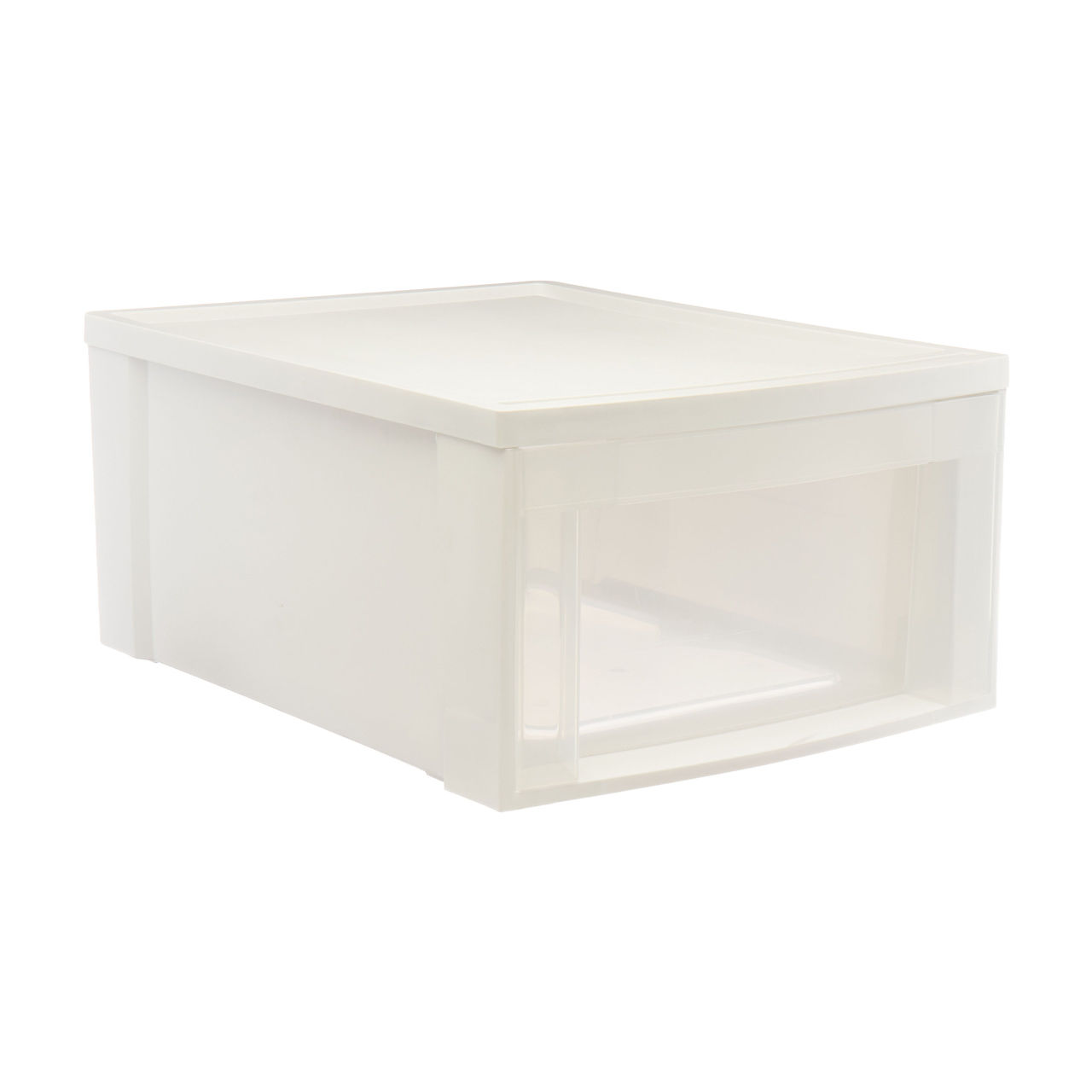 Keep your space organized and clutter-free with our versatile Medium Stacking Storage Drawer. Designed to make the most of your storage areas, this practical drawer is perfect for storing everything from office supplies and craft materials to clothing and household items. This medium-sized drawer offers ample storage space while maintaining a compact footprint. The clear front panel allows for easy visibility of contents, so you can quickly find what you need without rummaging through multiple boxes. Crafted from durable, high-quality plastic, this storage drawer is built to last. Its sturdy construction ensures it can handle daily use and the weight of stacked units without bending or breaking. The smooth sliding mechanism makes opening and closing the drawer effortless, providing quick access to your stored items. One of the standout features of this drawer is its stackable design. The flat top surface allows you to securely stack multiple drawers on top of each other, optimizing vertical space and keeping your storage area neat and tidy. Whether you’re organizing a closet, garage, or office, this stacking drawer is a smart and efficient solution. The neutral white color and sleek design blend seamlessly with any decor, making it a stylish addition to any room. Its versatile functionality means you can use it in various settings, from home offices and craft rooms to bedrooms and laundry areas. Simplify your storage solutions with the Medium Stacking Storage Drawer from pOpshelf. It’s the perfect combination of convenience, durability, and style, ensuring your belongings are always neatly organized and easily accessible.