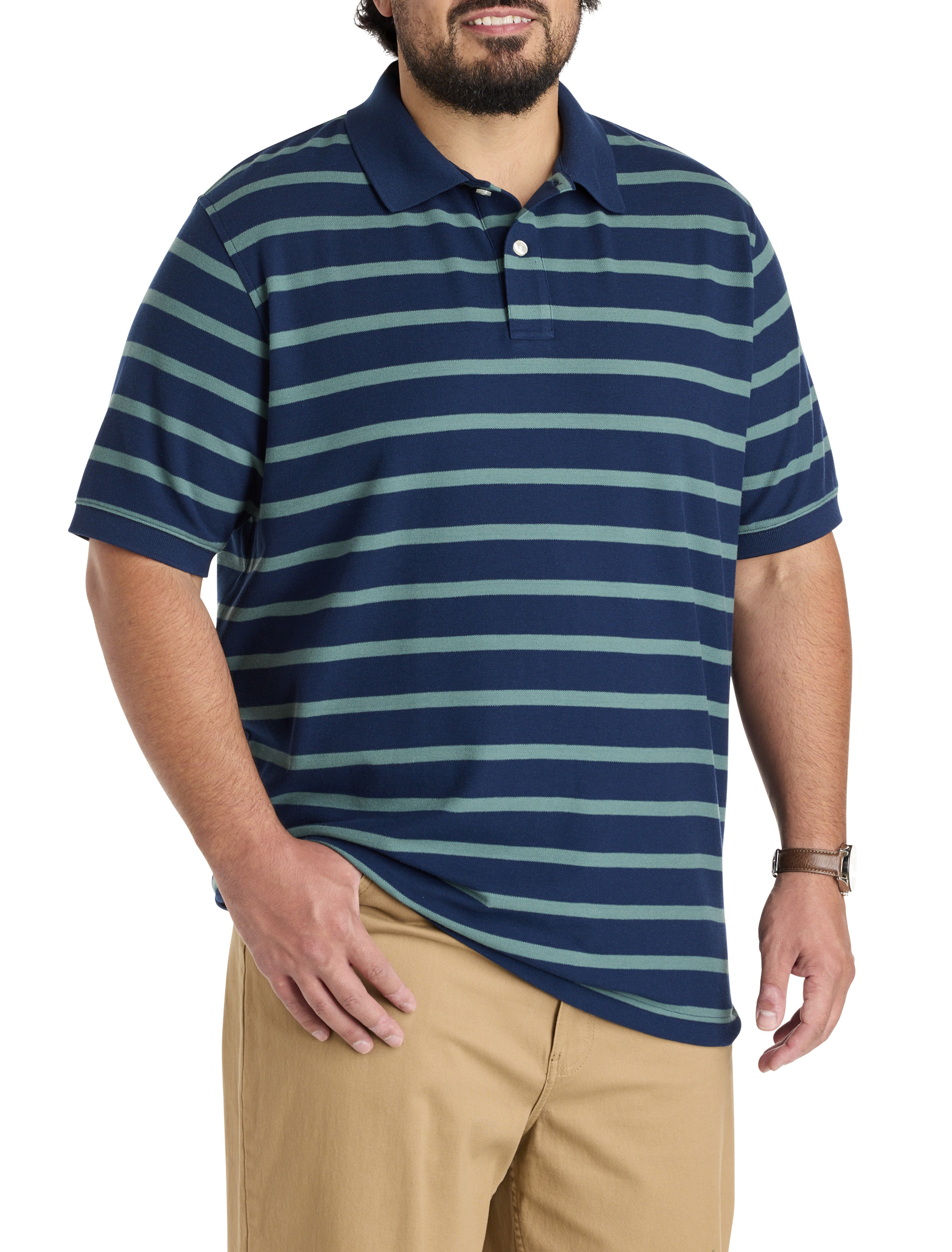 A striped design, tagless collar and a roomy, comfortable fit make this polo shirt from Harbor Bay a must-have addition to your collection. Designed at DXL with precise proportions and an ideal fit for Big and Tall guys, it's made from a soft, breathable cotton blend and looks great with everything from shorts to jeans to khakis.