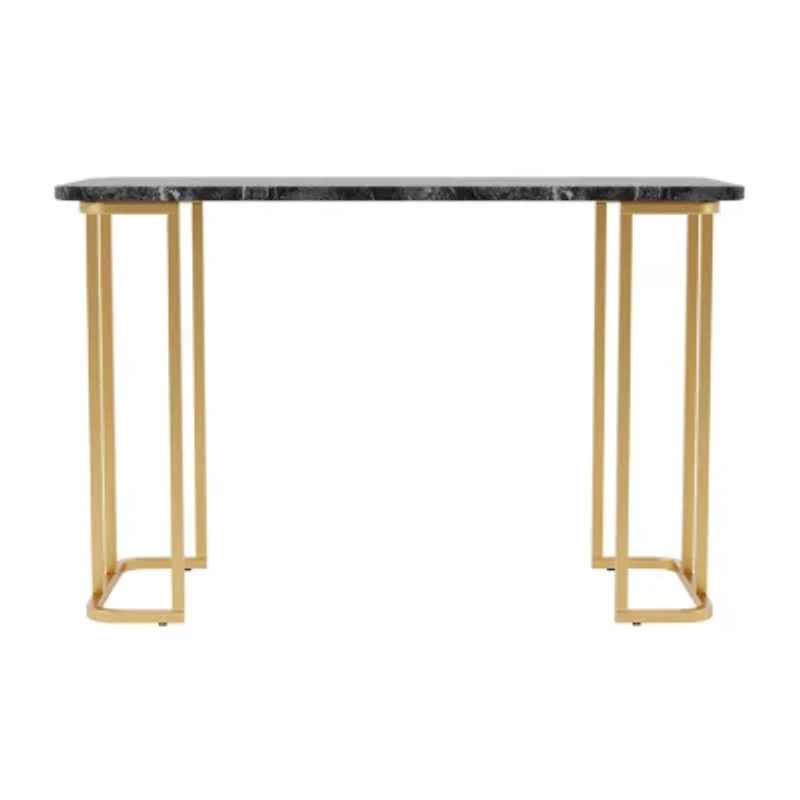 Perfectly sleek and sophisticated, this gold and black finish console table with a steel metal base has an attractive faux marble tabletop with eye-catching veining and detail to enhance sophisticated decor. Rounded corners offer a smooth and polished final design while the airy appearance of the legs creates a statement. Matching coffee and end tables are available to create a coordinated living space.