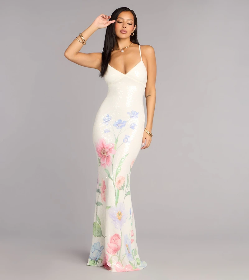Melany Floral Sequin Lace-Up Formal Dress