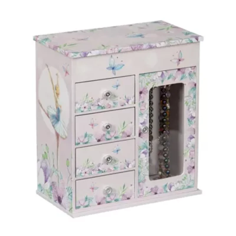 At Mele and Co we’ve been helping family and friends like you organize your jewelry and accessories since 1912. Our founder Emidio Mele came to America from Italy and began to learn his trade of crafting designer jewelry cases. Our company is still run by the Mele family 3 generations later. We believe that everything should have a place in your home, especially jewelry and small treasures. This Lilliana Ballerina Jewelry Box is the perfect storage unit for jewelry and trinkets that deserve a home. Don’t let your little one keep her special items sitting out or on a dresser where they could get lost. This jewelry box has perfectly sized compartments and drawers that are sure to fit all her storage needs. Choking hazard Warranty available China Imported Product Specifications 9.75 X 6.25 X 10.75 Care Clean with a soft cloth.