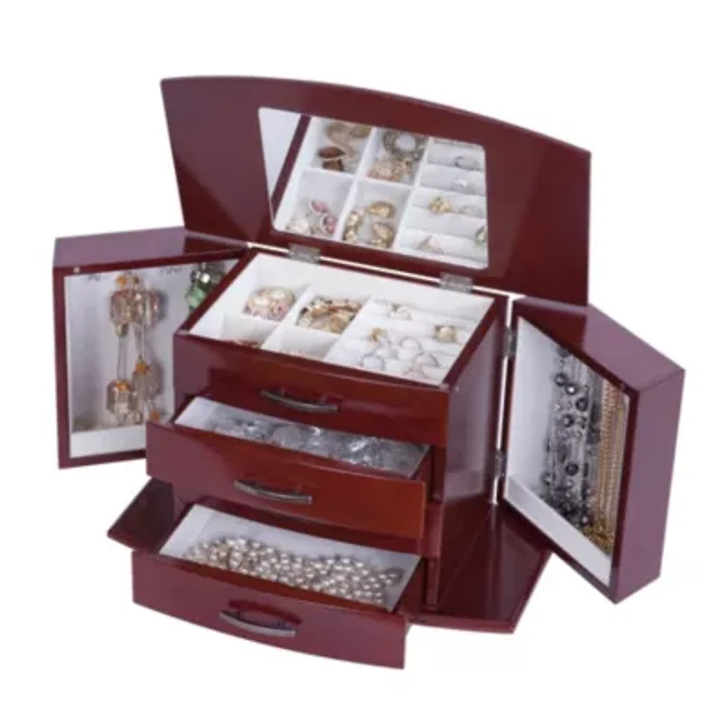 Like a gift waiting to be opened, the Mele and Co Sutton jewelry box is a true treasure. With its top lift lid and room for your favorites, this beautiful mahogany brown box offers both high style and compact jewelry storage. Smooth wood jewelry box in reddish brown, long drawer pulls in gold color, make this the ultimate jewelry organizer for women or men. Warranty available China Imported Product Specifications 15.5 X 9 X 10.75 Material & Care Wood Clean with a soft cloth.