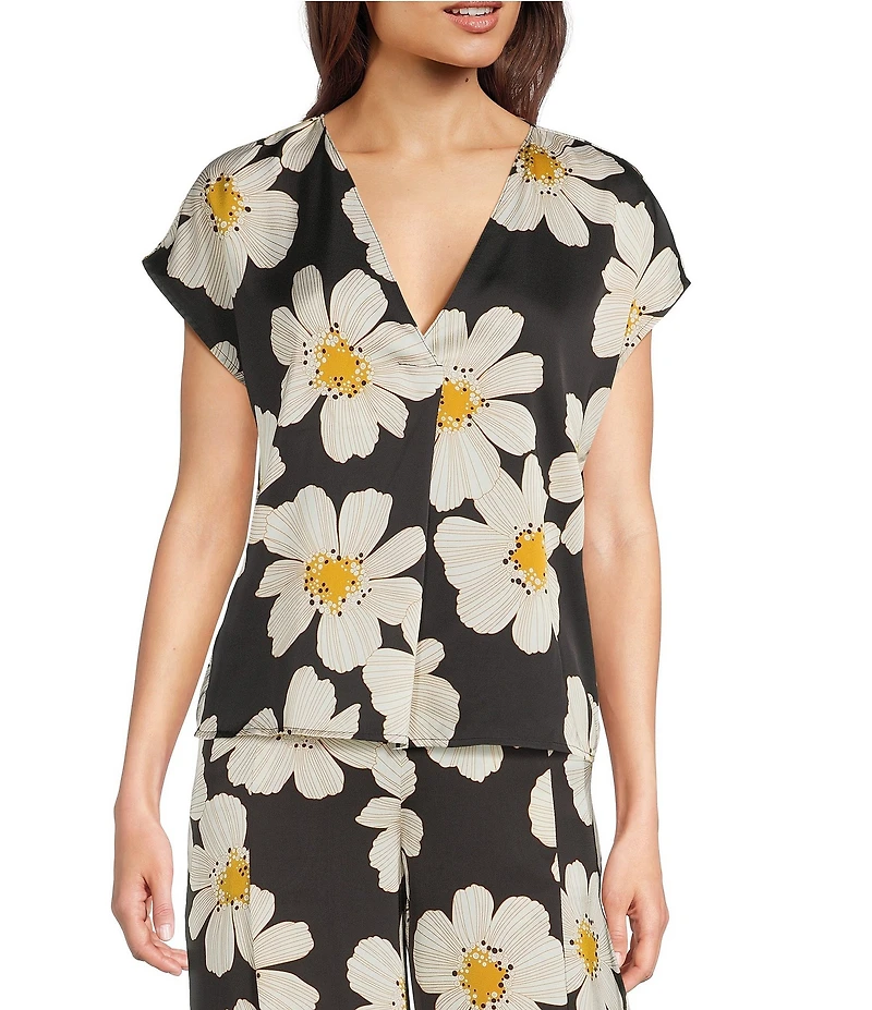 MELLODAY Coordinating Satin Daisy Print V-Neck Cap Sleeve Top