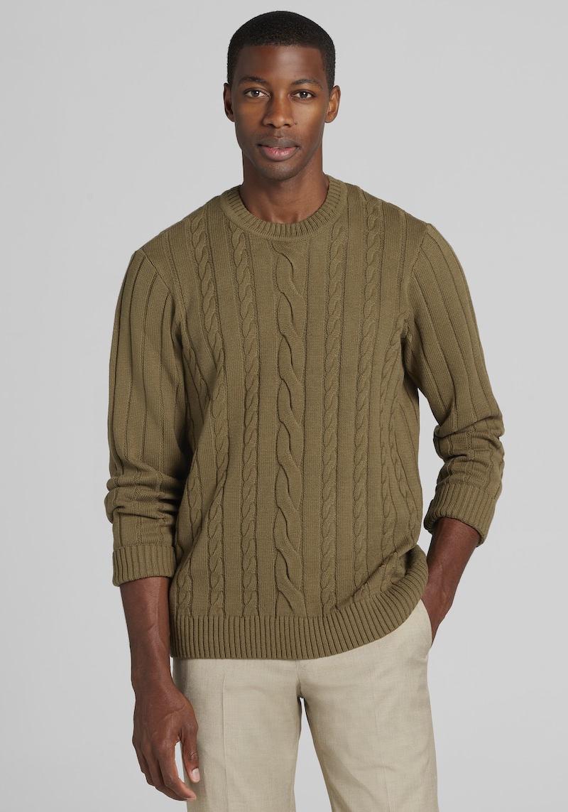 Men's 1905 Collection Tailored Fit Cable Knit Crew Neck Sweater at Jos. A. Bank, Green/Olive