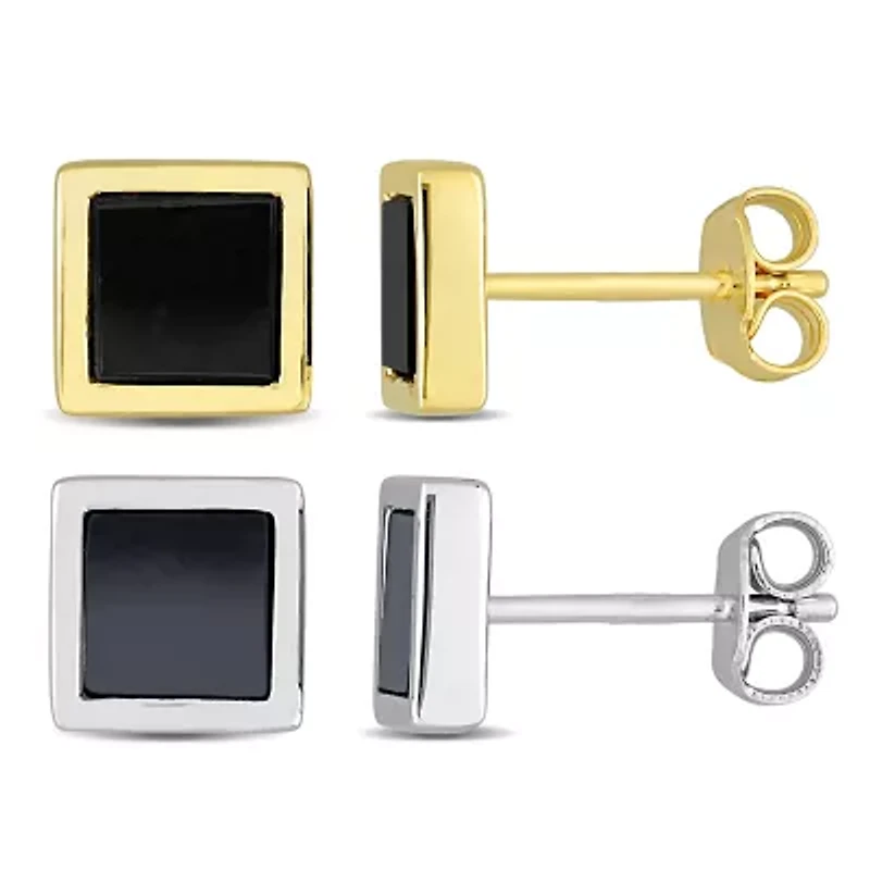 Make a bold and confident statement with this striking stud earring set. Featuring square black onyx and hematite, the deep, rich tones create a powerful and refined look. Crafted in a mix of yellow and white sterling silver, the design offers a modern contrast that enhances its distinctive style. The clean, geometric shape adds a touch of sophistication with a masculine edge. A versatile set that embodies strength, confidence, and timeless style. 4 Post back, Butterfly clasp Polished finish Warranty available, 60 days Thailand Imported Material & Care Two-Tone Silver Metal, Two-Tone Clean with a soft cloth.