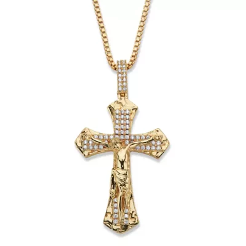 Divinely inspired, this men's pendant necklace features a crucifix set against a backdrop of sparkling cubic zirconia rounds. It's a handsome and faithful piece he'll always cherish. 2.05 carats T.W. 22" length box chain. Richly plated in 14k yellow gold.Main Stone: 16 Round Faceted Cut Cubic Zirconias, .40 carat total weight, 1.75 mm x 1.75 mmAccent Stone: 50 Cubic Zirconias 1.65 cttw14k Gold-Plated; Includes 14k Gold-Plated ChainPendant: 38 mm wide x 70 mm long x 11.5 mm high; Chain: 2 mm wide x 22 inches long x 2 mm highIncludes gift box and drawstring pouch14k Gold-PlatedIncludes 14k Gold-Plated ChainPendant Dimensions: 38 mm wide x 70 mm long x 11.5 mm high, Chain Dimensions: 2 mm wide x 22 inches long x 2 mm highIncludes gift box and drawstring pouch 2 Lobster closure, 66 Polished finish Prong setting Warranty available, Limited liability warranty, 30 Days China Imported Product Specifications Pendant: 38 mm wide x 70 mm long x 11.5 mm high; Chain: 2 mm wide x 22 inches long x 2 mm high, 22" length 2.05 Material & Care Metal, Gold plated Clean with a soft cloth.