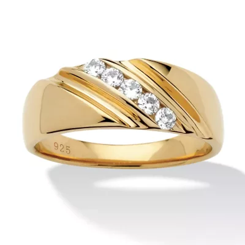Swirled with a diagonally set row of cubic zirconia, this classic band is just the answer for today's man on the way up. .50 carat T.W. Sleek and elegant in 18k gold-plated sterling silver. Sizes 8-16. (All carat weights are approximate and may vary slightly from those listed.)Main Stone: 5 Round Faceted Cut Cubic Zirconias, .50 carat total weight, 3 mm x 3 mm18k Gold-Plated Sterling Silver; Contains 8.30 grams of Sterling SilverMeasures: 20 mm wide x 8 mm long x 4 mm high; Shank Width: 1.5 mm wideIncludes gift box and drawstring pouch18k Gold-Plated Sterling SilverContains 8.30 grams of Sterling SilverShank Width: 1.5 mm wideDimensions: 20 mm wide x 8 mm long x 4 mm highIncludes gift box and drawstring pouch 5 Polished finish Channel setting Warranty available, Limited liability warranty, 30 Days China Imported Product Specifications 20 mm wide x 8 mm long x 4 mm high; Shank Width: 1.5 mm wide 0.5 Material & Care Metal, Sterling silver Clean with a soft cloth.