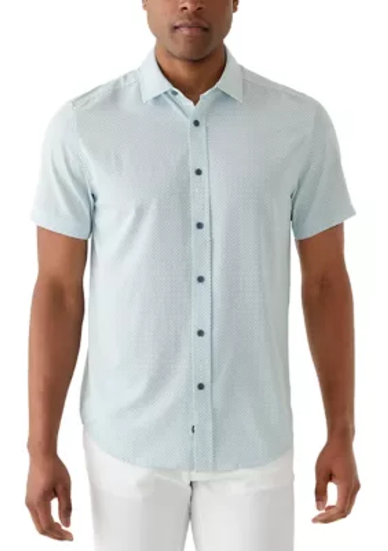 This versatile Kenneth Cole shirt features a geometric print for all-day comfort and wear. Button closure Collar Short sleeves Geometric pattern Imported Material & Care Polyester, spandex Machine washable