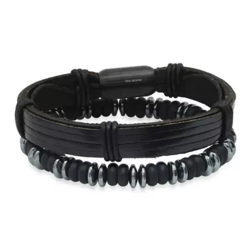 Men's black leather/black ip stainless steel and hematite/lava beaded 2pc set bracelets Magnetic closure Imported Product Specifications leather: 8.5" L x 0.5" W, beaded: 8-10" L x 8mm" W Material & Care Metal, Stainless steel Clean with a soft cloth.