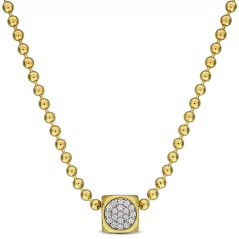 Make a bold and elegant statement with this striking pendant necklace. Featuring a rich black onyx center, it creates a captivating contrast with the sparkling white topaz accents that surround it. The design brings together modern sophistication and timeless appeal in a beautifully balanced silhouette. Crafted in yellow-plated sterling silver, it offers a warm and refined finish that enhances its overall brilliance. A versatile piece that adds confidence, style, and a touch of dramatic elegance to any look. Lobster closure Polished finish Pave setting Warranty available, 60 days Thailand Imported Product Specifications 20" Material & Care Sterling Silver Metal, Sterling silver Clean with a soft cloth.