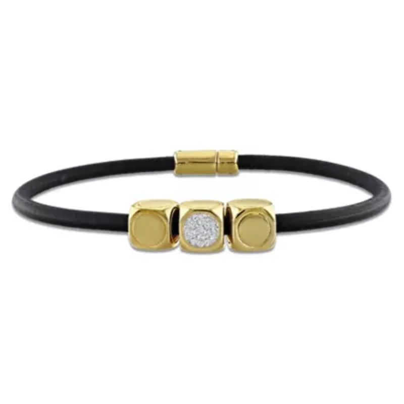 Make a bold and modern statement with this distinctive cube charm bracelet. The sleek black leather band pairs effortlessly with yellow-plated sterling silver for a striking contrast that feels both edgy and refined. A sparkling diamond accent adds a subtle touch of brilliance, elevating the design with just the right amount of shine. Its contemporary cube charm brings a unique, fashion-forward appeal. A versatile piece that adds confidence, style, and a hint of sophistication to any look. Jewelry clasp Color rating: H, G Clarity rating: I2-I3 Polished finish Warranty available, 60 days Thailand Imported Product Specifications 8" Material & Care Sterling Silver Metal, Sterling silver Clean with a soft cloth.