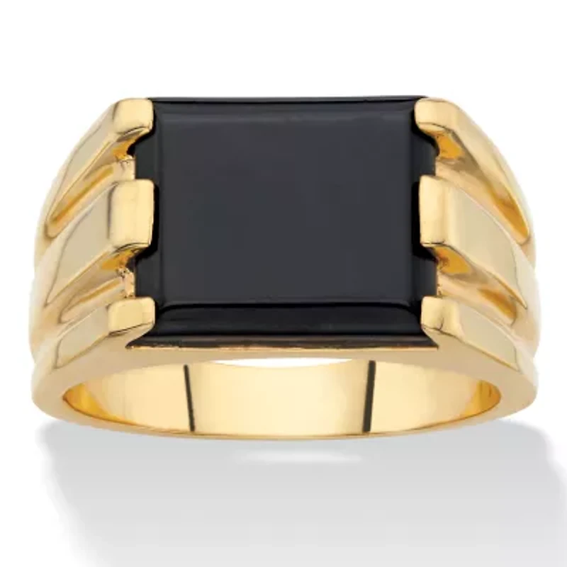 Classic lines give this men's ring an air of sophistication and elegance. The emerald-cut simulated black onyx center stone is set against a shank featuring channels tunneled into it for handsome dimension and shine. Yellow Gold-Plated. Sizes 8-13.Main Stone: 1 Emerald Buff Top Cut Simulated Black Onyx, 14 mm x 12 mm14k Gold-PlatedMeasures: 23.5 mm wide x 12 mm long x 3.5 mm high; Shank Width: 3.5 mm wideIncludes gift box and drawstring pouch14k Gold-PlatedShank Width: 3.5 mm wideDimensions: 23.5 mm wide x 12 mm long x 3.5 mm highIncludes gift box and drawstring pouch 1 Polished finish Pave setting Warranty available, Limited liability warranty, 30 Days China Imported Product Specifications 23.5 mm wide x 12 mm long x 3.5 mm high; Shank Width: 3.5 mm wide Material & Care Metal, Gold plated Clean with a soft cloth.