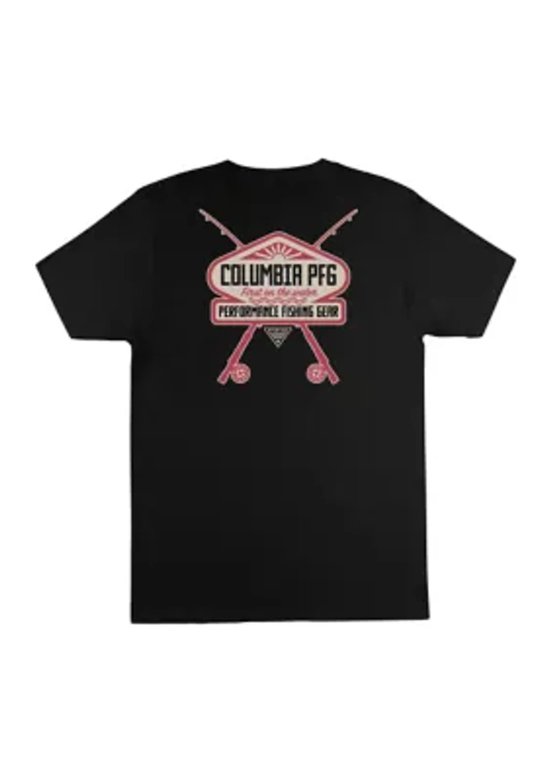 This classic, versatile Columbia t-shirt features a front and back graphic for all-day comfort and wear. Crew neck, band collar Short sleeves Imported Material & Care 100% cotton Machine washable