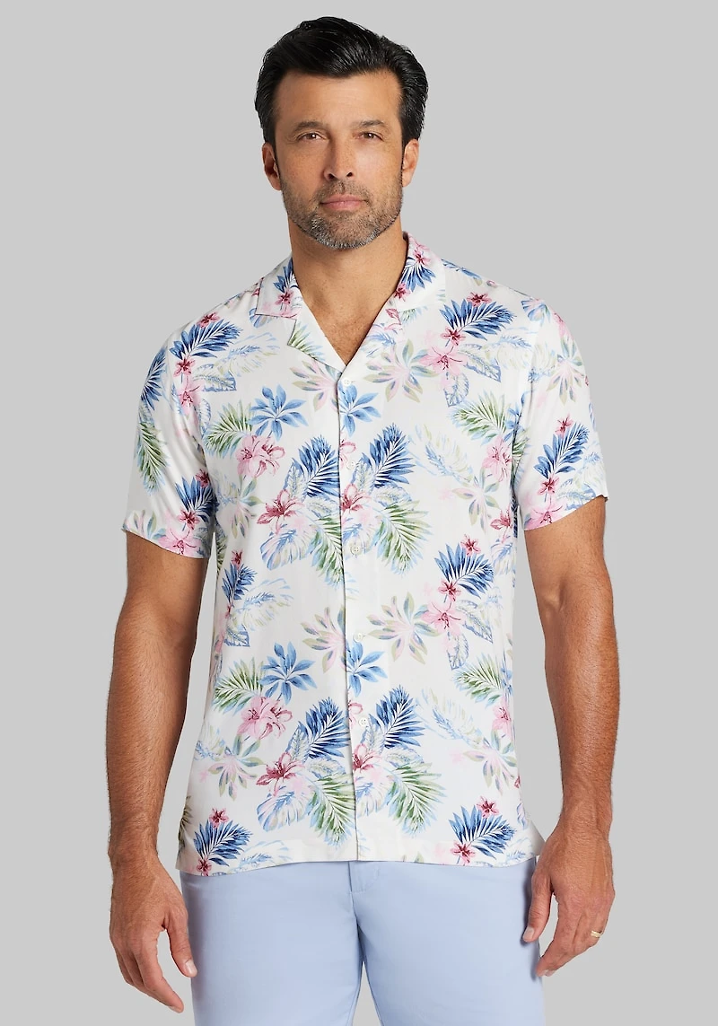 Offering a polished take on warmweather style, this Tailored Fit sportshirt pairs a relaxed camp collar with a Tailored Fit for a sharp, refined look. Crafted from 100 viscose, it delivers an exceptionally soft, fluid drape that feels cool and lightweight against the skin making it perfect for elevated casual wear. The lotusinspired pattern adds a touch of personality, making it an easy choice for both day and evening outings. Jos. A. Bank Tailored Fit Lotus Short Sleeve Sportshirt