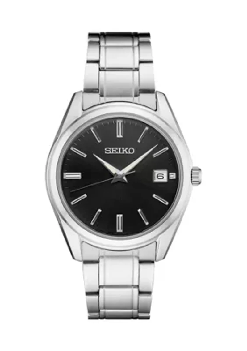 A bold black dial dominates this watch from Seiko, glistening with sapphire crystals for a luxurious finish. Foldover clasp Analog dial Quartz movement Date display Brushed finish Warranty available Imported Product Specifications 40 mm case size Material & Care Silver-tone metal Clean with a soft cloth
